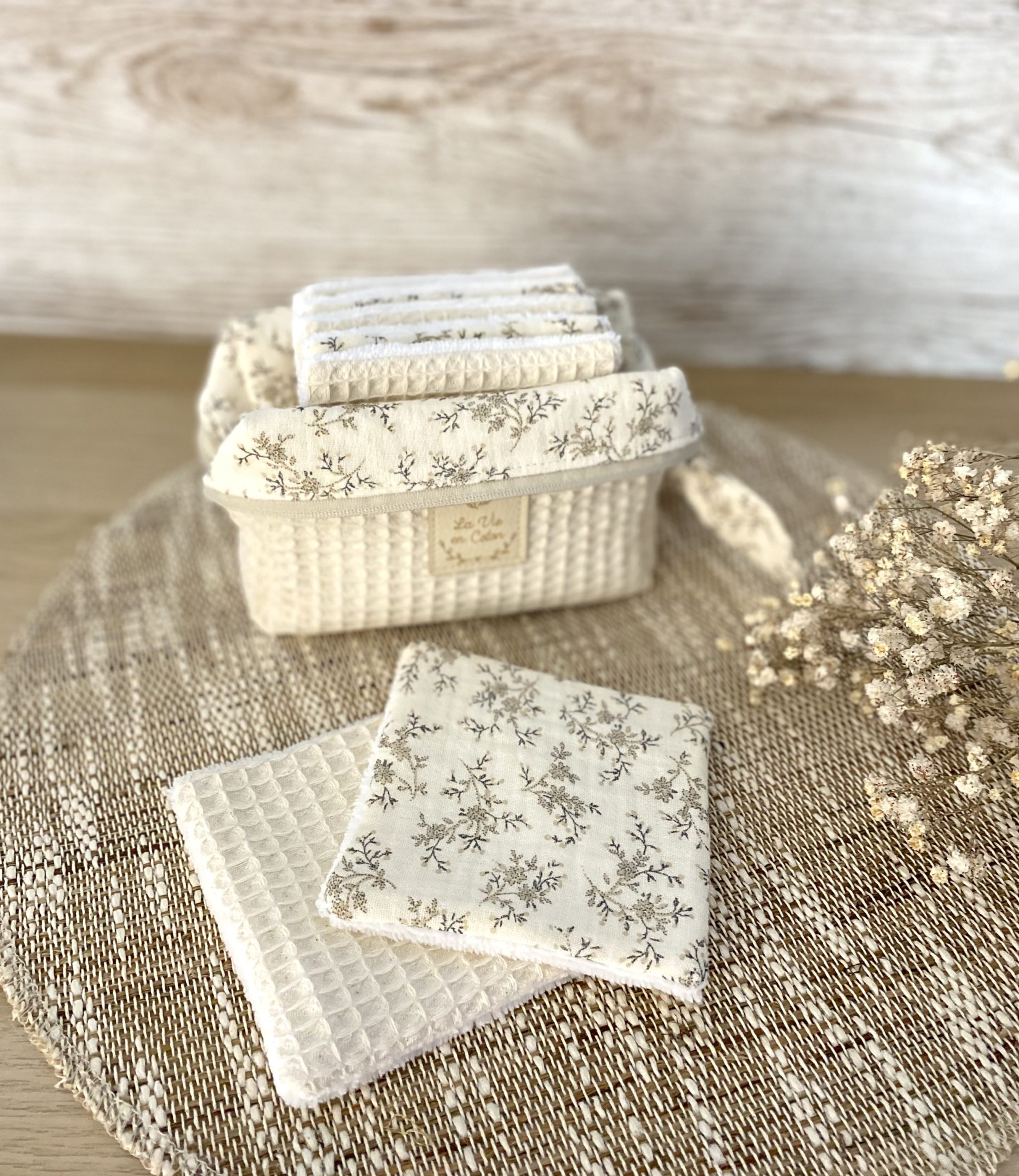 Petite trousse de toilette en nid d’abeille avec 7 lingettes nettoyantes – démaquillantes, très douces pour la peau grâce à son éponge de bambou.